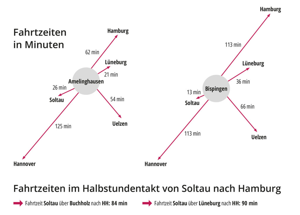 In Soltau werden die Züge des Heidekreuzes jeweils etwa zur vollen Stunde eintreffen, die Züge der Strecke Lüneburg – Soltau zur halben Stunde. Für die Soltauer Bürger ergibt sich daraus ein Halbstundentakt Richtung Hamburg über Buchholz (1h 25 Min) oder über Lüneburg (1h 32 Min). Sobald ab ca. 2040 das Konzept der LNVG umgesetzt ist, soll es auch einen Halbstundentakt von Soltau nach Hannover geben.
